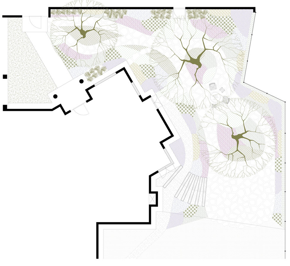 La vegetación propuesta incluye especies que atraen polinizadores, una enredadera para cubrir la reja existente y se continúa el lenguaje de la vegetación existente.
